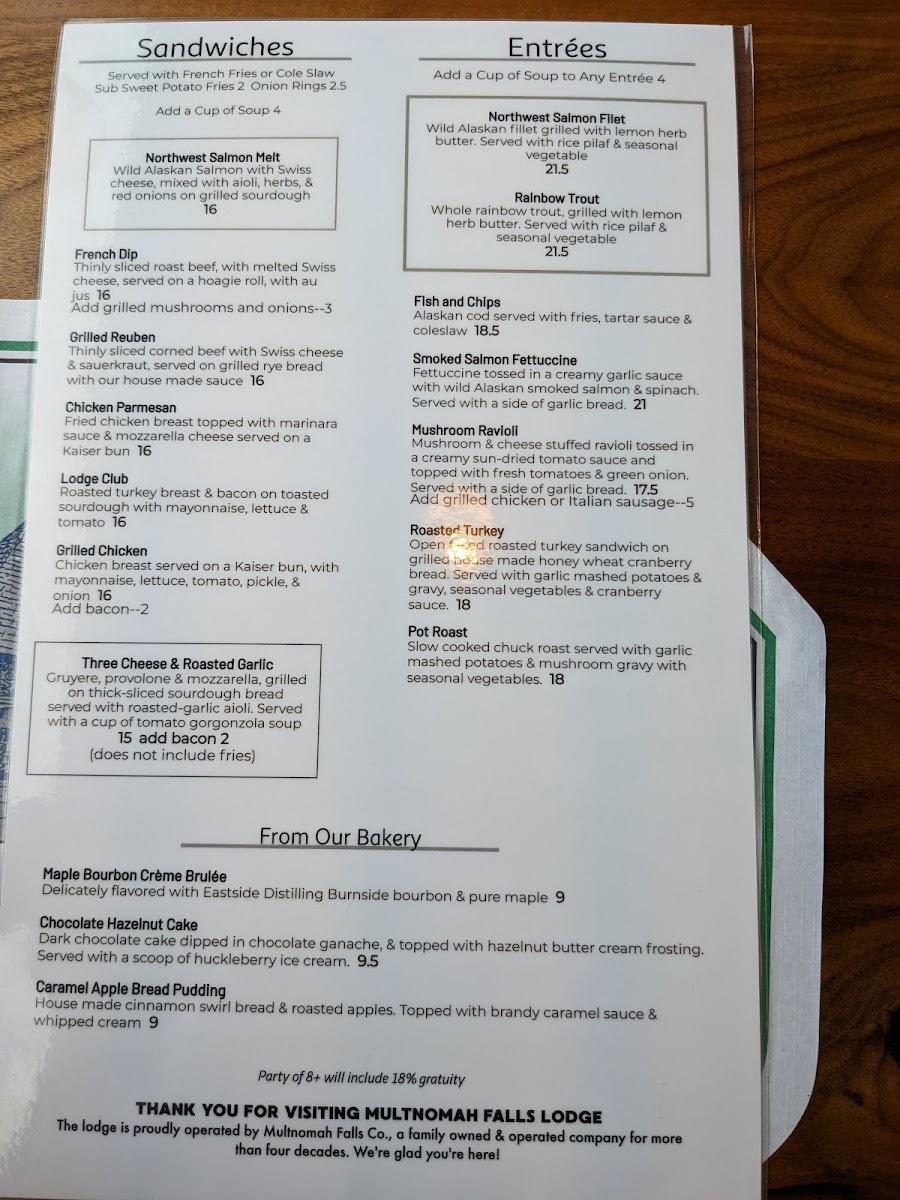 Every dish at Multnomah Falls Lodge is crafted with care. The Grilled Reuben ($18.00) is a must-try for those who crave hearty comfort food. Meanwhile, vegetarians will appreciate the flavorful Falafel at $17.50, serving as a perfect lightweight option that doesn't skimp on taste.